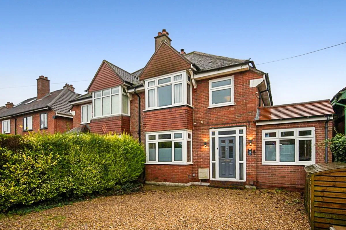 Extended 1930s semi-detached home offered with no forward chain, featuring four double bedrooms, three bathrooms across each floor, a modern kitchen with skylight, driveway plus garage/workshop and a private rear garden, all set in a central Fareham location close to schools, transport links and local amenities. View the full listing at www.rokmarsh.co.uk